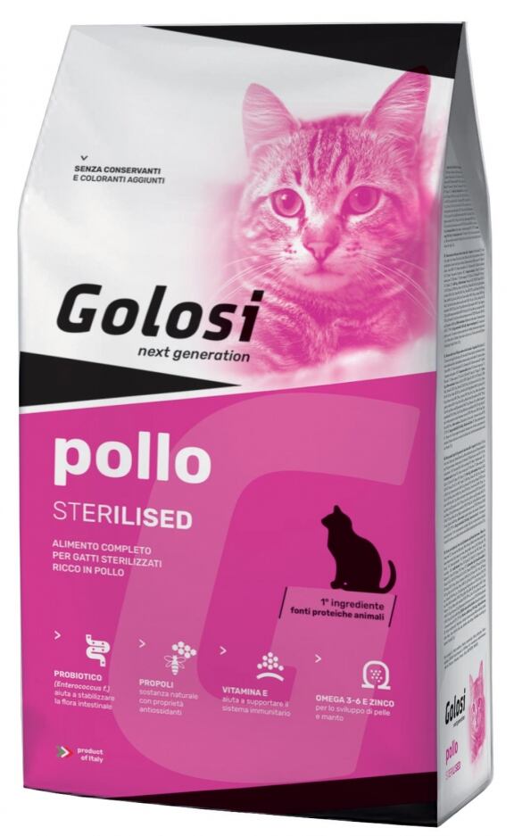 Golosi pollo sterilised è la soluzione nutrizionale con adeguati livelli di magnesio ideale per il gatto sterilizzato: l’elevata inclusione di pollo rende l’alimento appetibile e digeribile. Il selenio in forma organica contribuisce a proteggere l’integrità dei tessuti mentre gli omega 3-6 e lo zinco sono validi alleati per pelle e manto: l’ampia integrazione di vitamine e minerali offre inoltre un importante supporto per l’organismo contribuendo a limitare i processi di ossidazione, per un gusto a tutto benessere.