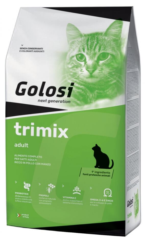 Golosi trimix è la soluzione nutrizionale ideale per il gatto adulto: il mix di pollo e manzo rende l’alimento particolarmente appetibile, apporta proteine a elevato valore biologico e aminoacidi, utili per un buon tono muscolare. Gli omega 3-6 e lo zinco sono validi alleati per pelle e manto, mentre il selenio contribuisce a proteggere l’integrità dei tessuti. L’ampia integrazione di vitamine e minerali offre inoltre un importante supporto per l’organismo contribuendo a limitare i processi di ossidazione, per un gusto a tutto benessere.