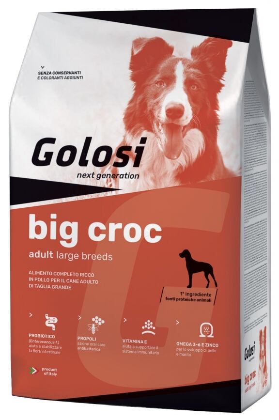 Golosi big croc è la soluzione nutrizionale ideale per il cane adulto di taglia grande, spesso molto vorace, che necessita di una crocchetta che favorisca la corretta deglutizione, fondamentale per una buona digestione. Il pollo, leggero e povero di grassi, è ideale per fronteggiare il rischio di eccessivo aumento di peso che graverebbe sulla struttura scheletrica. L’integrazione di glucosamina e condroitina aiuta inoltre a supportare le articolazioni impegnate a sostenere una notevole massa corporea.