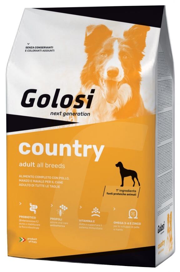 Golosi country è la soluzione nutrizionale ideale per il cane adulto di qualsiasi taglia: il pollo risulta leggero e digeribile mentre il manzo e il maiale donano grande appetibilità.