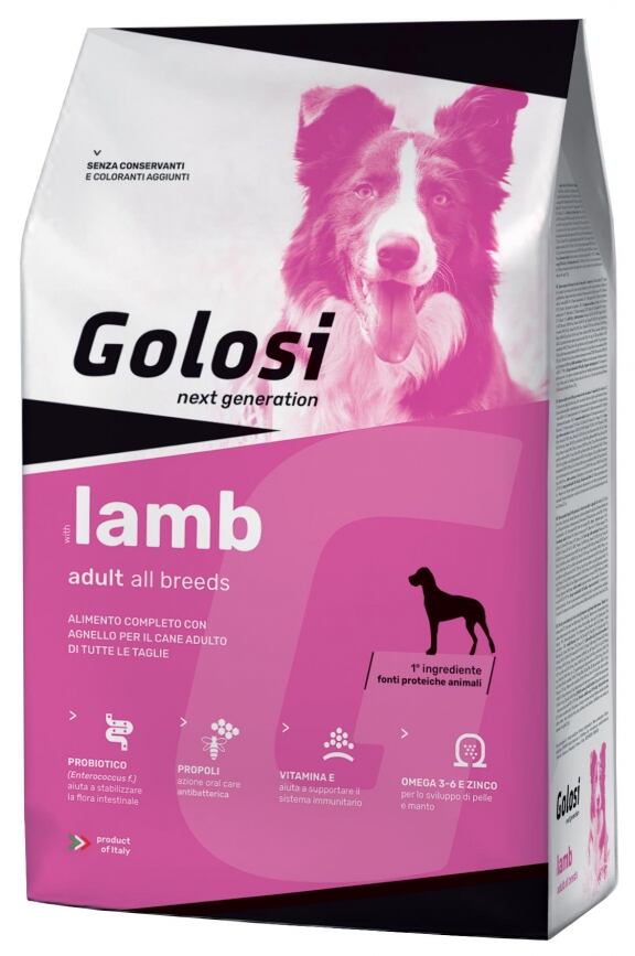 Golosi with lamb è la soluzione nutrizionale ideale per il cane adulto di qualsiasi taglia: l’agnello, fonte proteica leggera e particolarmente appetibile, rispetta la natura del cane. La propoli svolge un’azione oral care e antibatterica inibendo la formazione della placca.