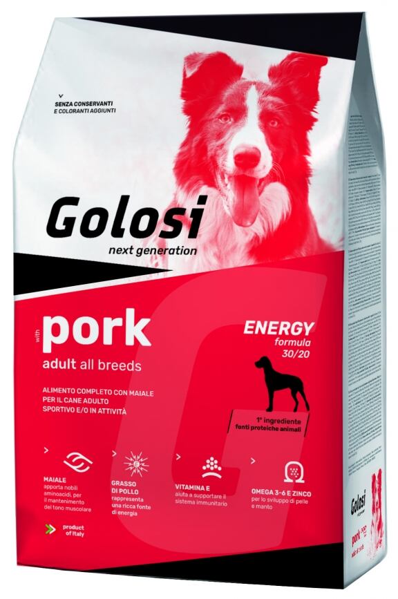 Golosi with pork energy formula è la soluzione nutrizionale ideale per il cane adulto attivo che necessita di un apporto energetico adeguato unitamente ad un elevato valore nutrizionale.