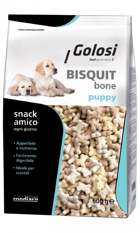 Bisquit BONE Puppy è un biscotto leggero e appetitoso, ideale come snack o premio per il tuo amico a quattro zampe. La particolare forma ad osso aiuta a ridurre la formazione del tartaro grazie all'azione meccanica della masticazione mantendedo così la salute di denti e gengive. Le materie prime di qualità lo rendono inoltre leggero e facilmente digeribile. L'innovativa confezione salvafreschezza richiudibile consente di mantenere il biscotto fresco e croccante così da conservare inalterate le sue proprietà per la gioia e il benessere del tuo cane ogni giorno.