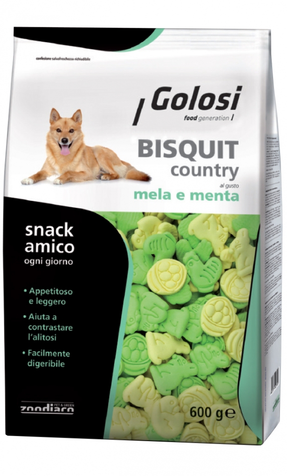 Bisquit COUNTRY al gusto Mela e Menta sono biscotti dai gusti appetitosi, pensati per il benessere e il divertimento del tuo amico a quattro zampe, in ogni momento della giornata. La particolare forma e la consistenza aiutano a ridurre la formazione del tartaro e mantenere in salute denti e gengive contribuendo a combattere l'alitosi.