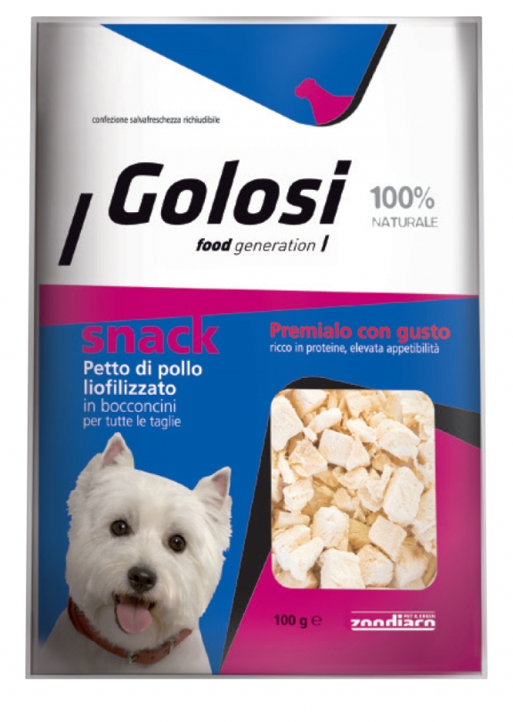 Golosi Food Generation Snack è un alimento complementare che può essere dato in qualsiasi momento della giornata come premio o snack. È formulato per il divertimento e il benessere del vostro cane. Si consiglia di somministrare al Vostro cane almeno uno snack al giorno contribuendo così a mantenere il Vostro cane sano e sempre in forma. Conservare in luogo fresco e asciutto. Lasciare sempre a disposizione acqua fresca e pulita. Rimuovere la confezione di deoxider prima di utilizzare.