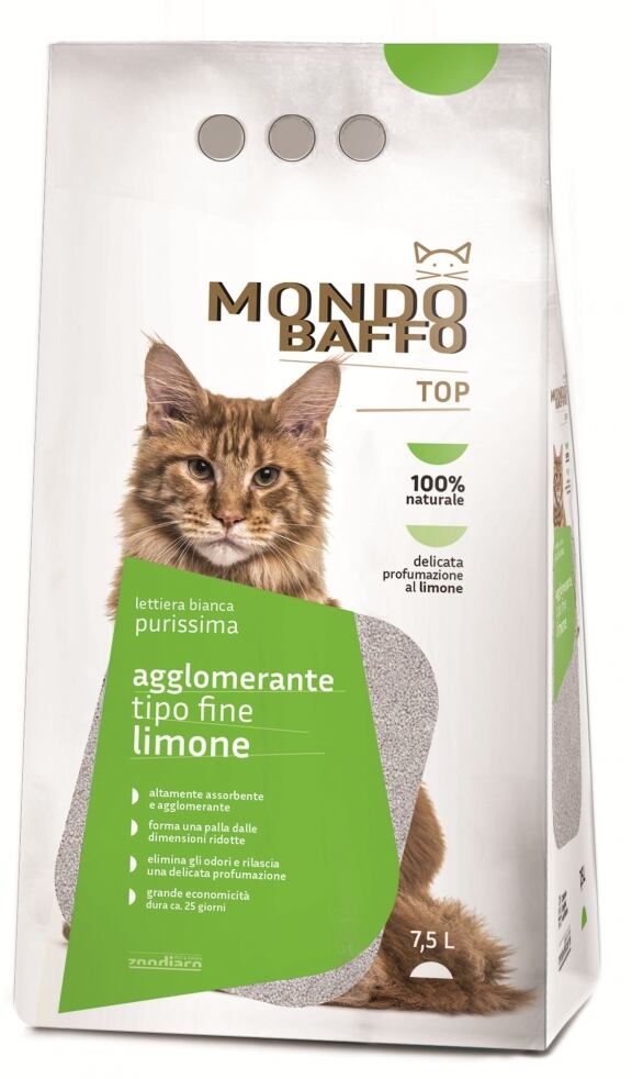 Mondo Baffo Top purissima agglomerante tipo fine limone è una lettiera igienica composta al 100% da bentonite bianca a grana fine altamente assorbente e agglomerante: una volta a contatto con l’urina rilascia un delicato profumo di limone così da rendere gradevole l’ambiente circostante. La ridotta dimensione del granulato permette una rapidissima agglomerazione e la formazione di una palla dalle dimensioni ridotte