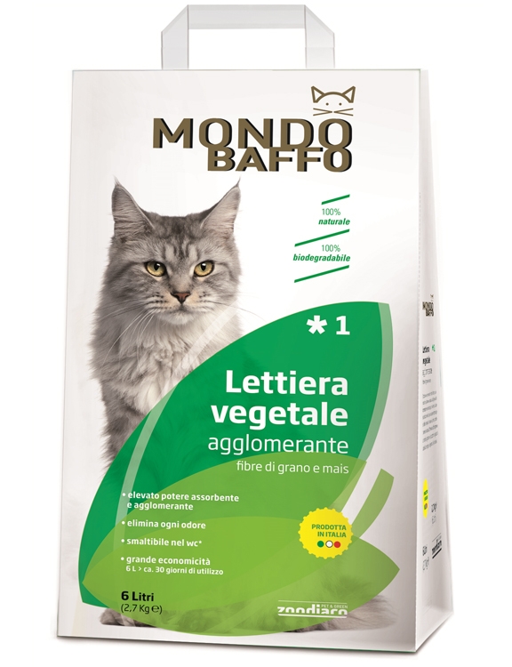 Mondo Baffo Vegetale Agglomerante 1 è una lettiera che garantisce un’elevata igiene ed un bassissimo spreco di prodotto. 100% naturale, 100% biodegradabile ed ecologica, sicura per l’ambiente e per il gatto, questa lettiera sfrutta solo fibre vegetali naturali derivate da sottoprodotti della macinazione del grano e del mais smaltibili nei rifiuti organici. Il principio attivo di origine naturale scompone le molecole responsabili del cattivo odore inibendo il proliferare di batteri. Ha un elevato potere assorbente ed agglomerante: dopo 30 secondi si può raccogliere la pallina formata dall’urina del gatto e smaltire, con moderazione, nel WC.domestico.