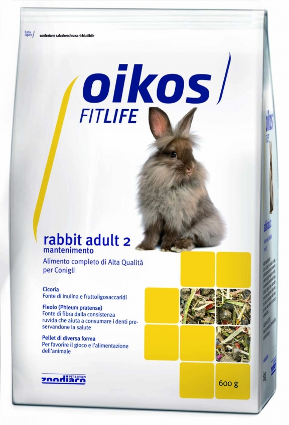 Oikos Fitlife Rabbit adult 2 è un alimento completo adatto ai conigli a partire da 6 mesi d’età. L’elevata percentuale di fibra, grazie al Fleolo (Phleum Pratense), fibra dalla consistenza ruvida, favorisce un corretto consumo dei denti e mantiene attive le funzioni gastrointestinali dell’animale. La cicoria è una preziosa fonte di inulina e fruttoligosaccaridi mentre l’assenza di cereali e il ridotto contenuto di amidi sono validi alleati per la flora intestinale.
