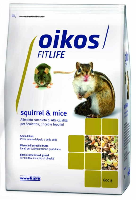 Oikos Fitlife Squirrel & Mice è un alimento completo con una miscela di cereali e frutta, adatto per l’alimentazione di scoiattoli, criceti, ratti e topolini. L’adeguato apporto proteico e un ridotto contenuto di grassi sono elementi fondamentali per la loro salute quotidiana. I semi di lino sono una ricca fonte di acidi grassi polinsaturi, per la salute del pelo e della pelle.