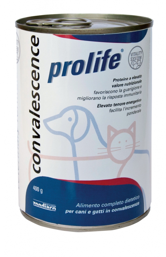 Prolife Convalescence wet è l’alimento completo dietetico specifico per cani o gatti in convalescenza in seguito a malattie gravi, traumi o che affrontano un decorso post operatorio. Le proteine a elevato valore nutrizionale favoriscono la guarigione e migliorano la risposta immunitaria mentre l’elevato tenore energetico facilita l’incremento ponderale, importante in soggetti che possono aver subito stress nutrizionali. Il maiale e il pollo rendono l’alimento particolarmente appetibile e digeribile per favorire l’assunzione da parte di animali inappetenti o defedati.