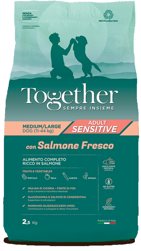 Composizione: Salmone 14% (di cui Salmone fresco* 8%, Salmone disidratato 6%), Farina di riso integrale, Farina di riso, Mais, Piselli, Riso, Trota disidratata, Grasso di pollo, Polpa di barbabietola, Proteina di patate, Sostanze minerali, Proteine di salmone idrolizzate, Mirtillo* 0,23%, Mela* 0,23%, Spinaci* 0,23%, Carota* 0,23%, Mannanooligosaccaridi* 0,1%, Inulina di cicoria – fonte di FOS – 0,1%, Glucosamina (0,03%), Solfato di condroitina (0,02%), Yucca schidigera* 0,01%.