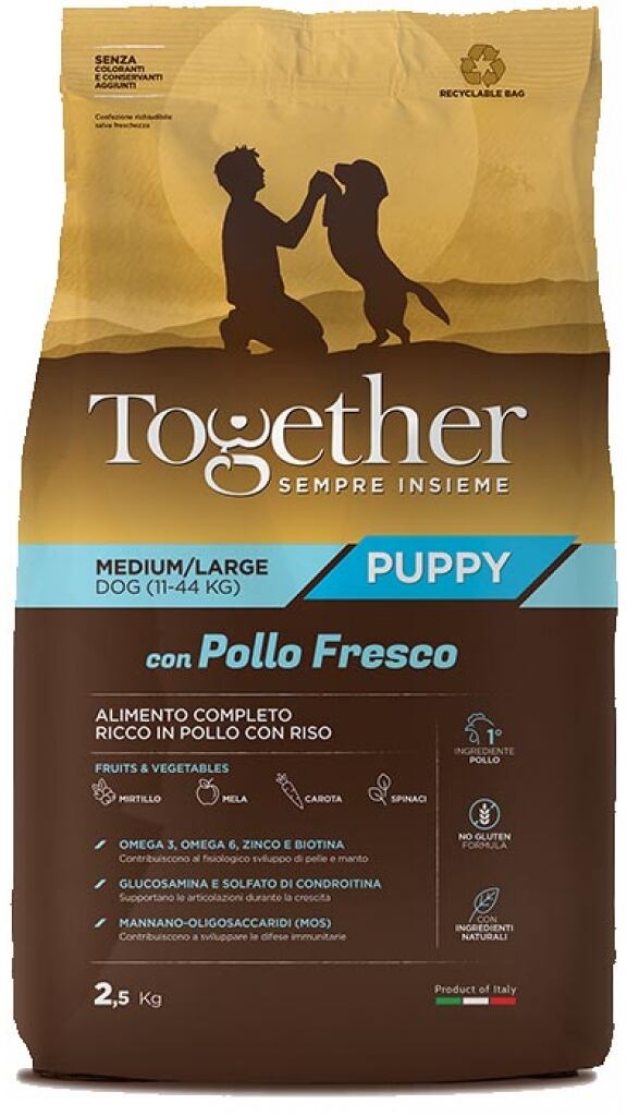 Composizione: Pollo 17,2% (di cui Pollo disidratato 9,2%, Pollo fresco* 8%), Farina di riso integrale, Mais, Farina di riso, Maiale disidratato, Piselli, Grasso di pollo, Riso* 4%, Proteine idrolizzate di pollo e tacchino, Polpa di barbabietola, Proteine idrolizzate di pollo e maiale, Sostanze minerali, Mirtillo 0,23%, Mela* 0,23%, Spinaci* 0,23%, Carota* 0,23%, Olio di salmone, Inulina di cicoria – fonte di FOS – 0,1%, Mannano-oligosaccaridi* 0,1%, Glucosamina 0,02%, Solfato di condroitina 0,01%, Yucca schidigera* 0,01%.