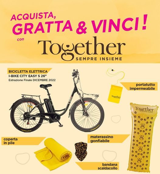 DAL 1 GIUGNO AL 30 NOVEMBRE 2022 partecipa al Gratta & Vinci Together… Per ogni confezione acquistata della linea Together Dog o Cat (a partire da 1,5 kg fino a 12kg), ricevi alla cassa una cartolina: grattando il riquadro sul fronte puoi vincere subito il premio corrispondente. In caso di vincita presentare la cartolina vincente, lo scontrino e un documento d’identità al negoziante per ritirare il premio. Inoltre sulla cartolina troverai un codice che permetterà di partecipare all’estrazione finale di una bicicletta elettrica registrare.