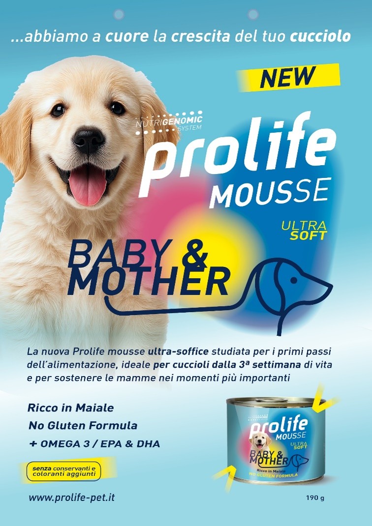 Prolife amplia la sua gamma con un’innovazione pensata per rispondere alle esigenze nutrizionali più delicate: Prolife Baby & Mother Mousse è il nuovo alimento ultra-soffice, altamente digeribile e ricco di nutrienti funzionali, ideale per i cuccioli nei primi stadi dello sviluppo e per le mamme durante i momenti più intensi, come la gestazione e l’allattamento.